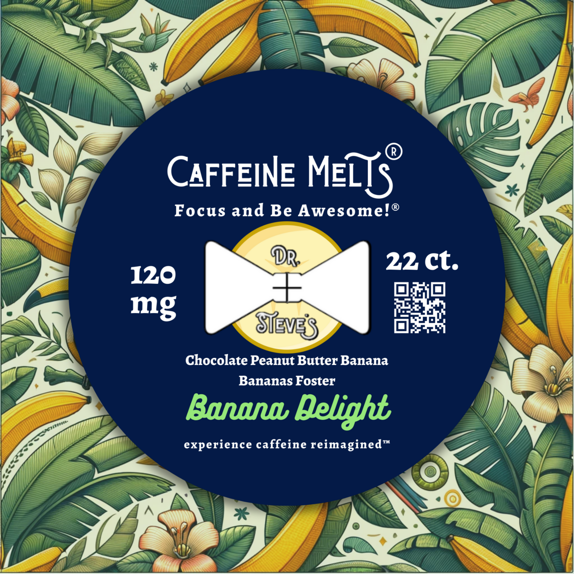 Say hello to Banana Delight, the 120mg Caffeine Melts® pack from Dr. Steve's! Our unique flavor combination of Chocolate Peanut Butter Banana and Bananas Foster brings together two delicious treats with each Melt. The perfect blend of rich chocolate, salty peanut butter, sweet banana, caramelized sugar, and buttery notes will give you the boost you need without any added sugars or artificial sweeteners - just place it under your tongue to dissolve so you can Focus and Be Awesome®! Enjoy this terrific twist on classic banana flavors with Dr. Steve's Caffeine Melts® – delightfully delicious sublingual satisfaction! |